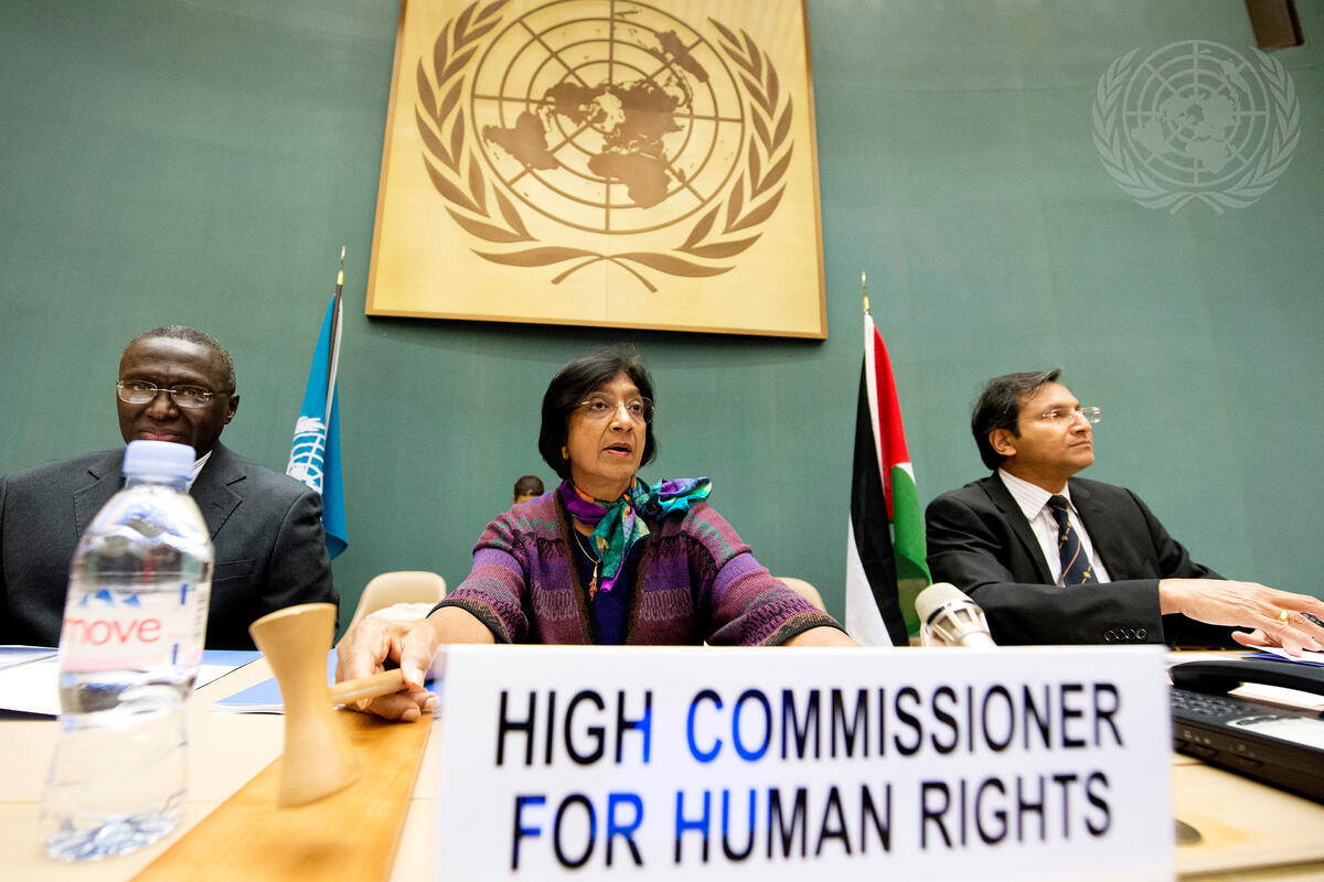 Navi Pillay (centre), UN High Commissioner for Human Rights, chairs a special meeting held in conjunction with today’s International Day of Solidarity with the Palestinian People at the UN’s headquarters in Geneva, Switzerland.