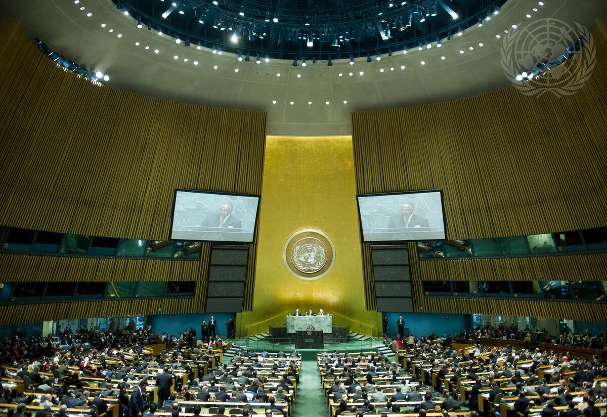 A wide view of the General Assembly Hall as Daffa-Alla Elhag Ali Osman (shown on screens), Permanent Representative of the Republic of the Sudan to the UN, introduces the draft resolution.