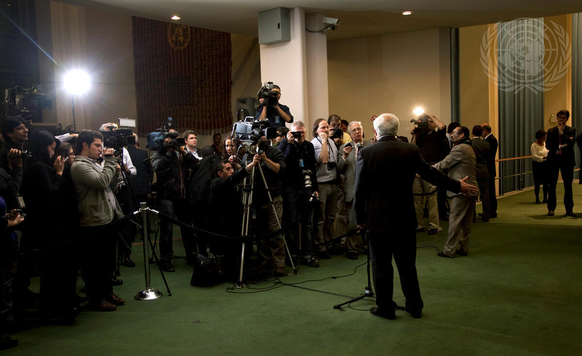 Riyad H. Mansour (back to camera), Permanent Observer of Palestine to the UN, speaks to journalists following the General Assembly's decision to grant Palestine non-member observer State status in the United Nations.