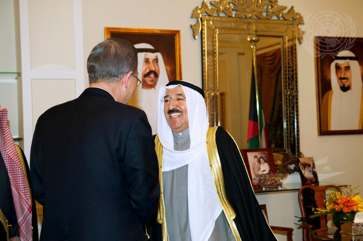 Secretary-General Ban Ki-moon (left, back to camera) meets with Sheikh Sabah Al-Ahmad Al-Jaber Al-Sabah, Amir of the State of Kuwait, at the official residence of the Amir, Dar Salwa, in Kuwait City.