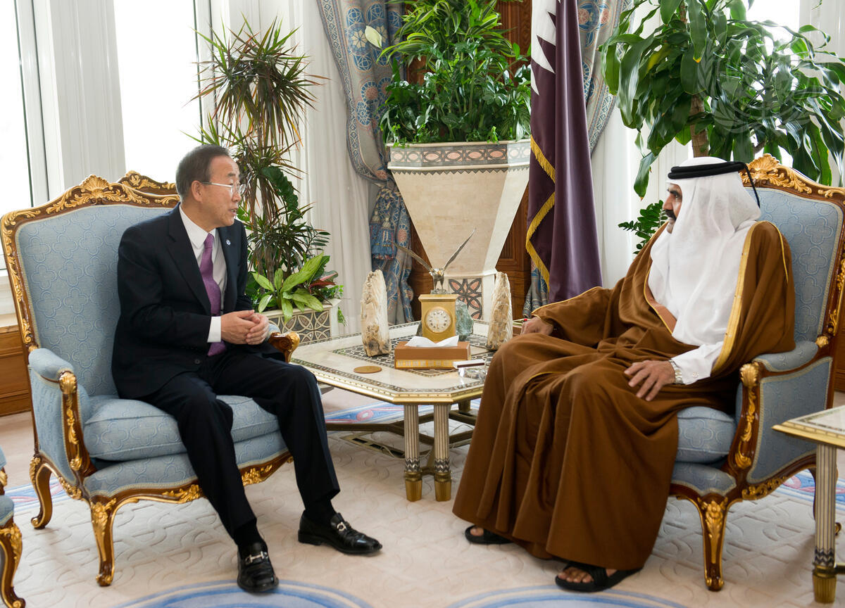 Secretary-General Ban Ki-moon (left) meets with Sheikh Hamad bin Khalifa Al-Thani, Amir of the State of Qatar, in Qatari capital Doha.