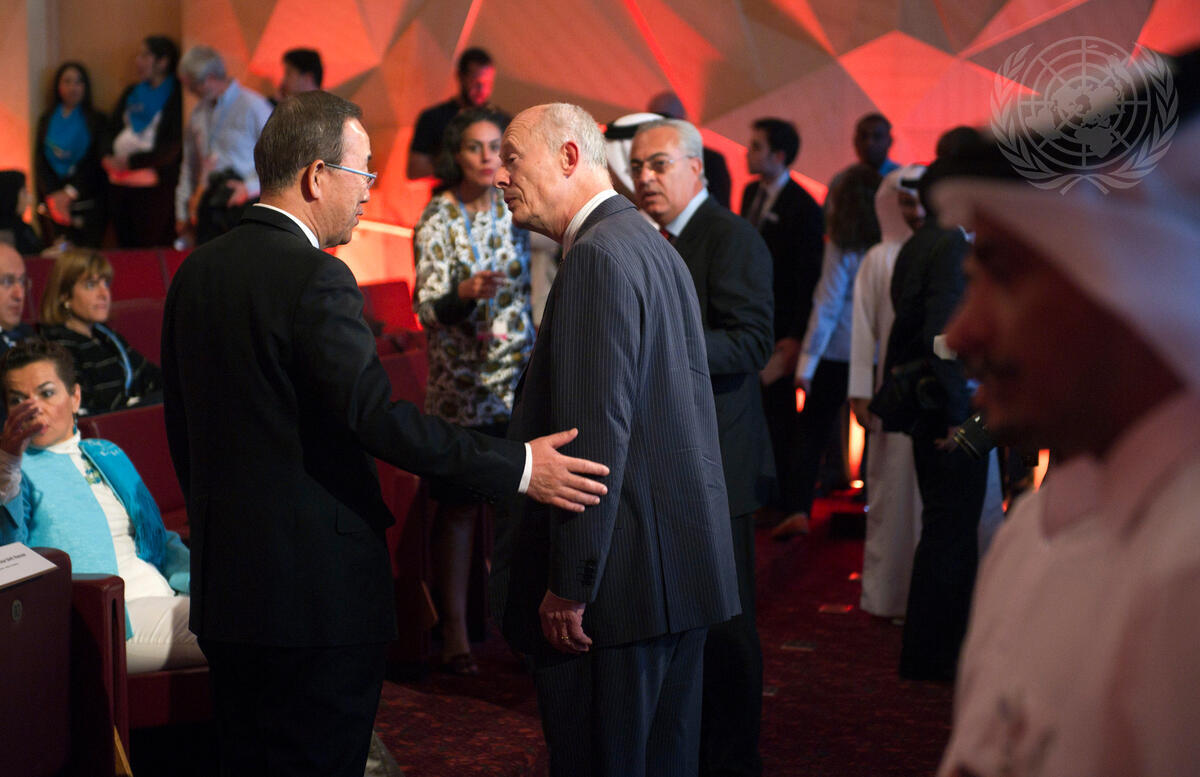 On the conference sidelines, Secretary-General Ban Ki-moon (centre left) speaks with Hans Joachim Schellnhuber, founding Director of the Potsdam Institute for Climate Impact Research (PIK), during the launch of the joint PIK-Qatar Foundation Climate Change Research Institute and Global Climate Change Forum.