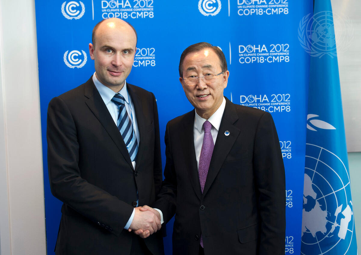 Secretary-General Ban Ki-moon (right) meets with Marcin Korolec, Minister of the Environment of Poland and incoming President-designate of the 19th session of the Conference of the Parties to the UN Framework Convention on Climate Change (COP 19), at the UN Climate Change Conference in Doha, Qatar.