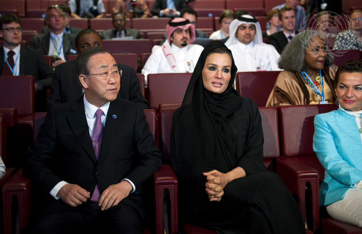 On the sidelines of the conference, Secretary-General Ban Ki-moon (left) and Christiana Figueres (right), Executive Secretary of the UN Framework Convention on Climate Change (UNFCCC), attend the launch of the Climate Change Research Institute and Global Climate Change Forum, joint projects of the Qatar Foundation and Potsdam Institute for Climate Impact Research (PIK), to be based in Qatar. With them is Sheikha Mozah bint Nasser Al Missned (centre), Chairperson of the Qatar Foundation.