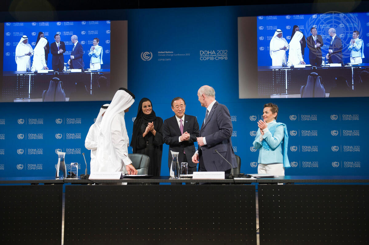 On the conference sidelines, Secretary-General Ban Ki-moon (centre, in purple tie) and Christiana Figueres (right), Executive Secretary of the UN Framework Convention on Climate Change (UNFCCC), attend the launch of the Qatar-based Climate Change Research Institute and Global Climate Change Forum, joint projects of the Qatar Foundation and Potsdam Institute for Climate Impact Research (PIK). Pictured with them are Sheikha Mozah bint Nasser Al Missned (left, facing camera), Chairperson of the Qatar Foundation, and Hans Joachim Schellnhuber (second from right, back to camera), founding Director of the Potsdam Institute.