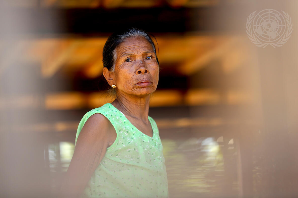 A woman stands in front of her newly-constructed home in a displacement camp in Maungdaw, Rakhine State, during Ms. Amos’ visit.