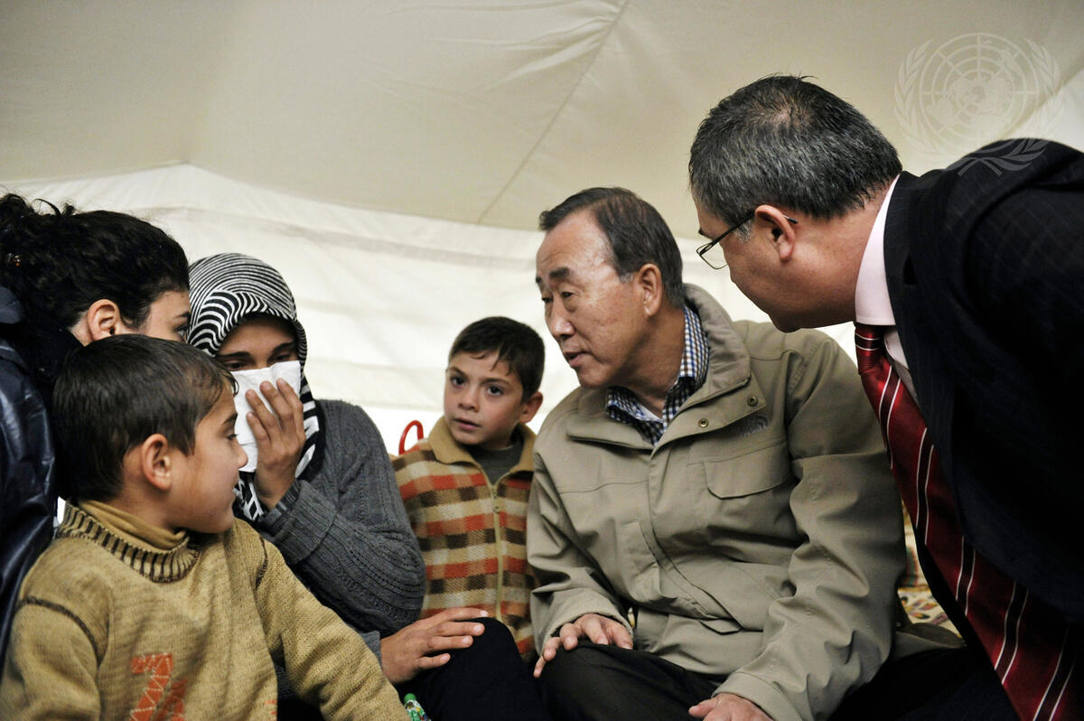 Secretary-General Ban Ki-moon (second from right) visits with Syrian refugees at a camp in the Turkish border town of Islahiye. Mr. Ban is on an official visit to Turkey, where he will also meet with the country’s political leaders.