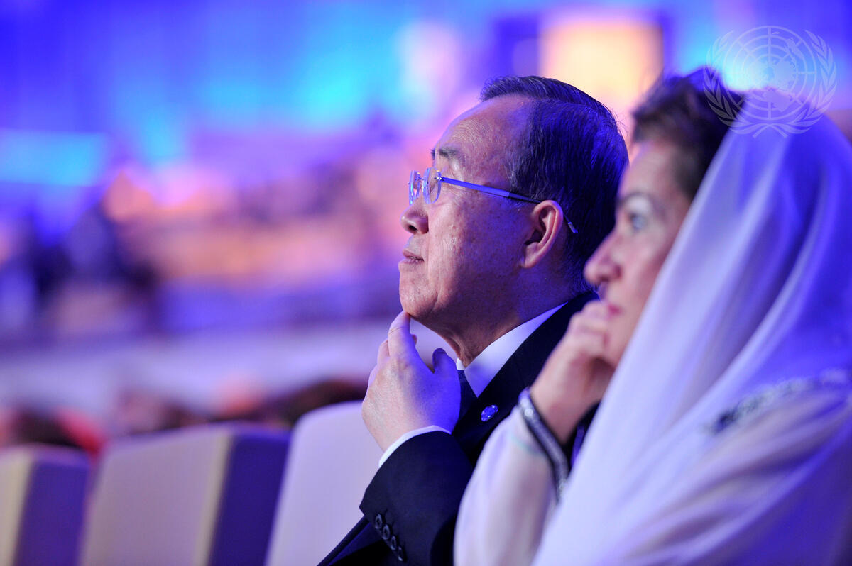 Secretary-General Ban Ki-moon (left) and Christiana Figueres, Executive Secretary of the United Nations Framework Convention on Climate Change (UNFCCC), attend the UNFCCC “Momentum for Change” Lighthouse Activity Showcase event on the opening day.