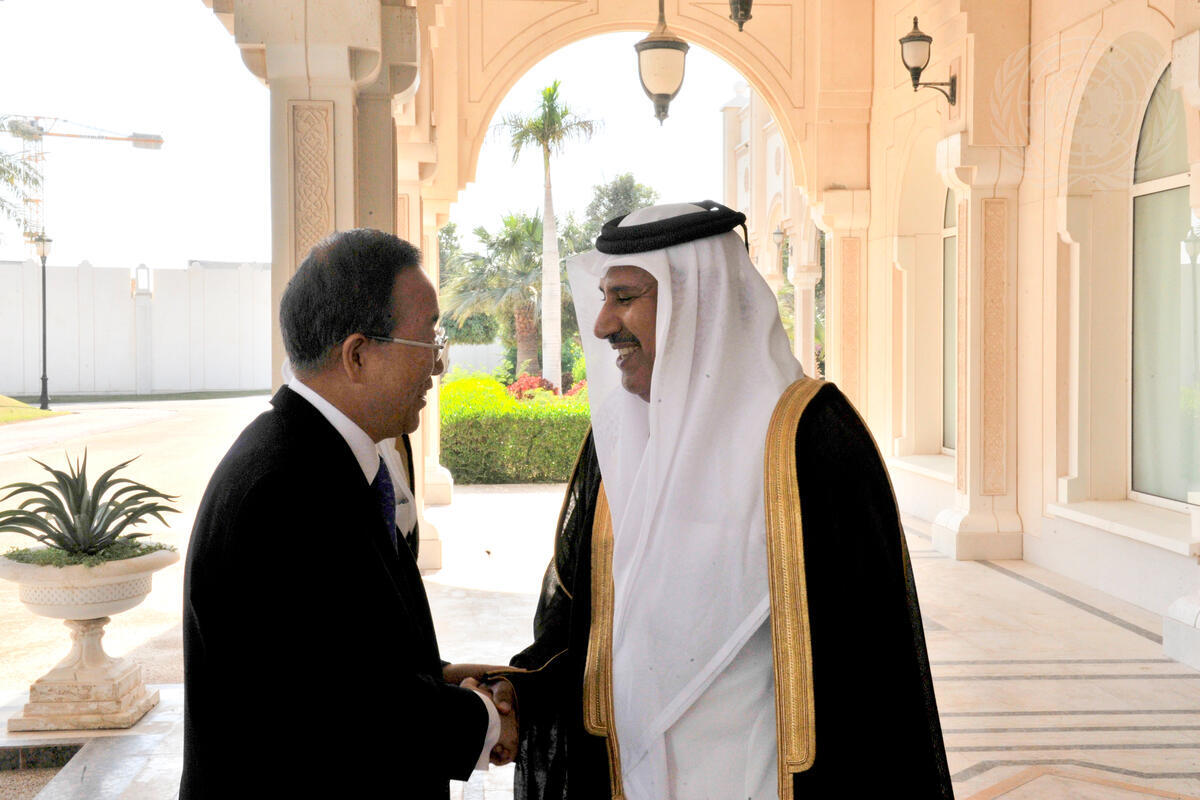Secretary-General Ban Ki-moon (left) meets with Sheikh Hamad bin Jassim bin Jabr Al-Thani, Prime Minister and Minister for Foreign Affairs of the State of Qatar, at the Prime Minister's residence in Doha.