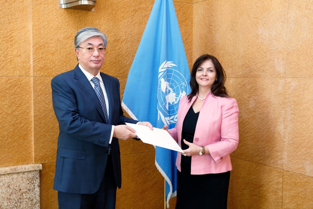 Filloreta Kodra (right), new Permanent Representative of the Republic of Albania to the UN Office at Geneva (UNOG), presents her credentials to Kassym-Jomart Tokayev, Director-General of UNOG.