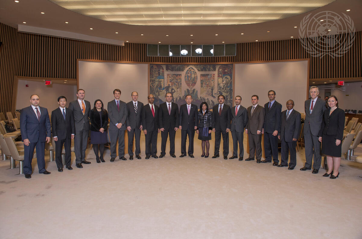 Secretary-General Ban Ki-moon (centre) poses for a group photo inside the Security Council Chamber with Political Advisers to the representatives of the Council's current member states.