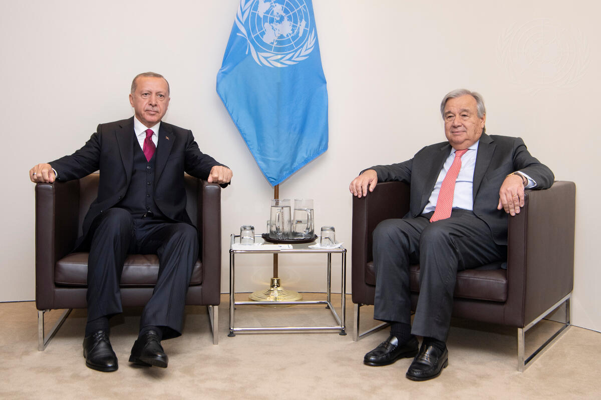 Secretary-General António Guterres (right) meets with Recep Tayyip Erdogan, President of the Republic of Turkey.