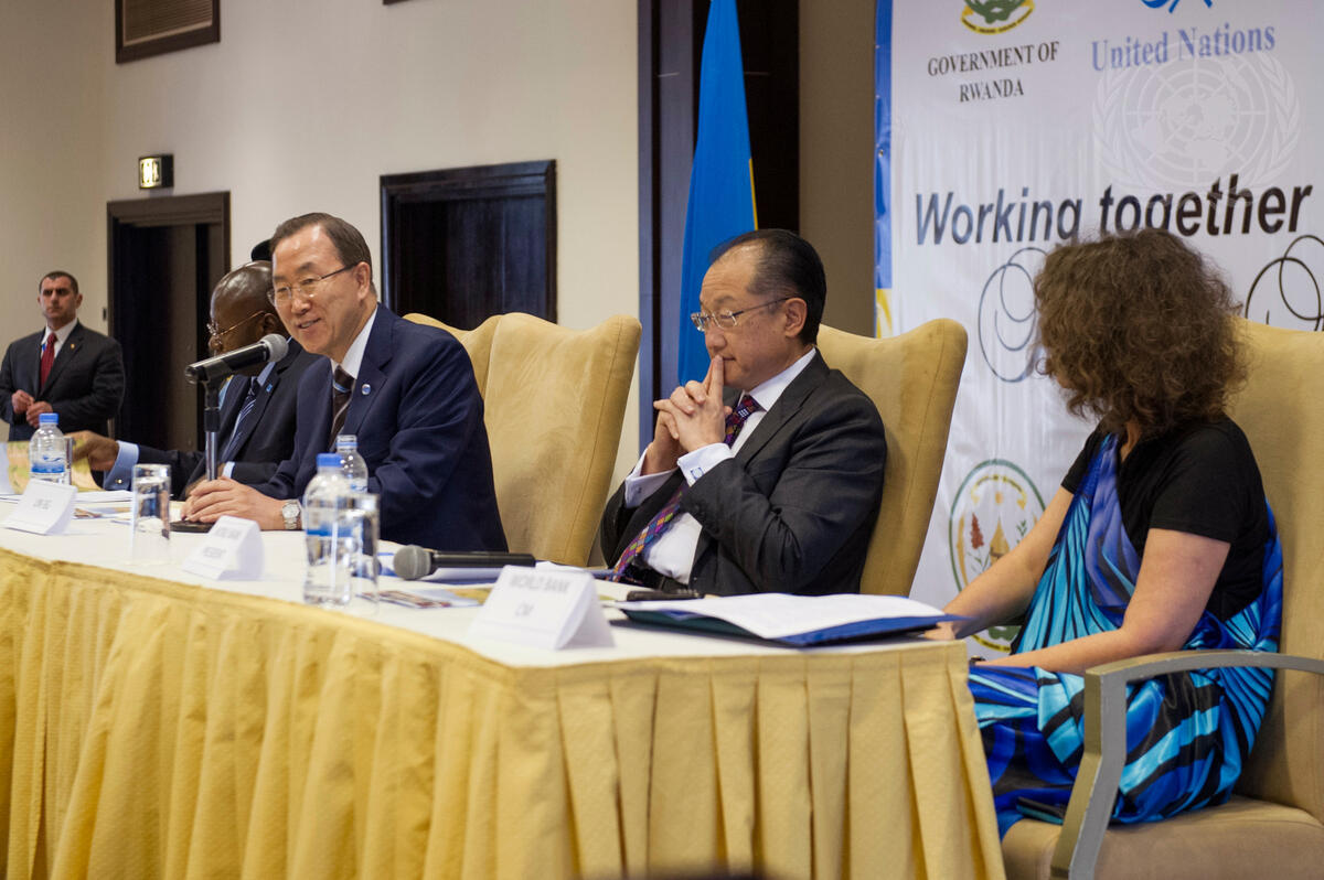 Secretary-General Ban Ki-moon (third from right) and Jim Yong Kim (second from right), President of the World Bank Group, hold a town hall meeting with United Nations and World Bank staff in Kigali, Rwanda.
