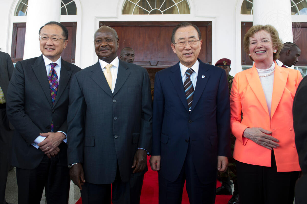Secretary-General Ban Ki-moon (third from left) and Jim Yong Kim (left), President of the World Bank Group, meet with Yoweri K. Museveni (second from left), President of the Republic of Uganda. Mary Robinson, the Secretary-General’s Special Envoy for the Great Lakes Region of Africa, stands to the right.