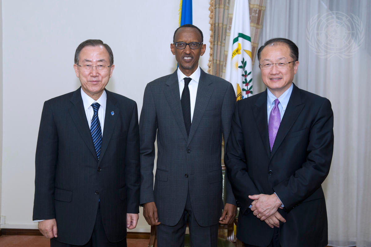 Secretary-General Ban Ki-moon (left) and Jim Yong Kim (right), President of the World Bank Group, meet with Paul Kagame, President of the Republic of Rwanda.