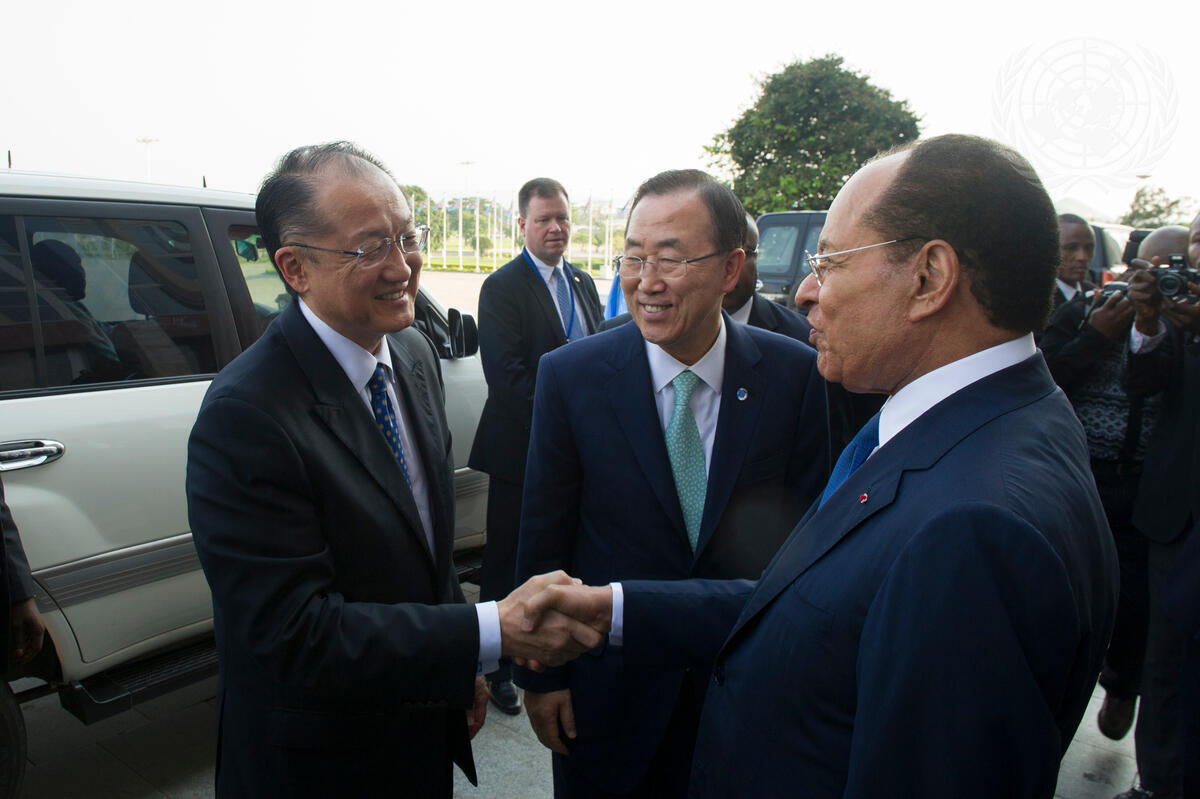 Secretary-General Ban Ki-moon (centre) and Jim Yong Kim (left), President of the World Bank Group, meet with Léon Kengo Wa Dondo, President of the Senate, Democratic Republic of the Congo.
