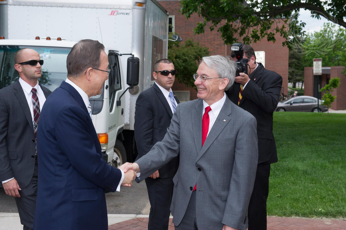 Mr. Ban (left) is welcomed by Chancellor Robert Coombe on his arrival at the University of Denver.