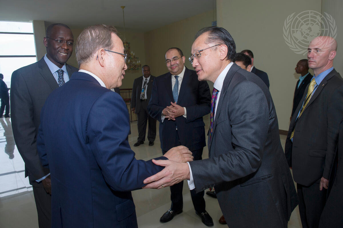 Secretary-General Ban Ki-moon (centre left) bids farewell to Jim Yong Kim (centre right), President of the World Bank Group, at the end of their joint mission to Africa’s Great Lakes region. Their trip spanned the Democratic Republic of the Congo, the Republic of Rwanda, and the Republic of Uganda over three days.