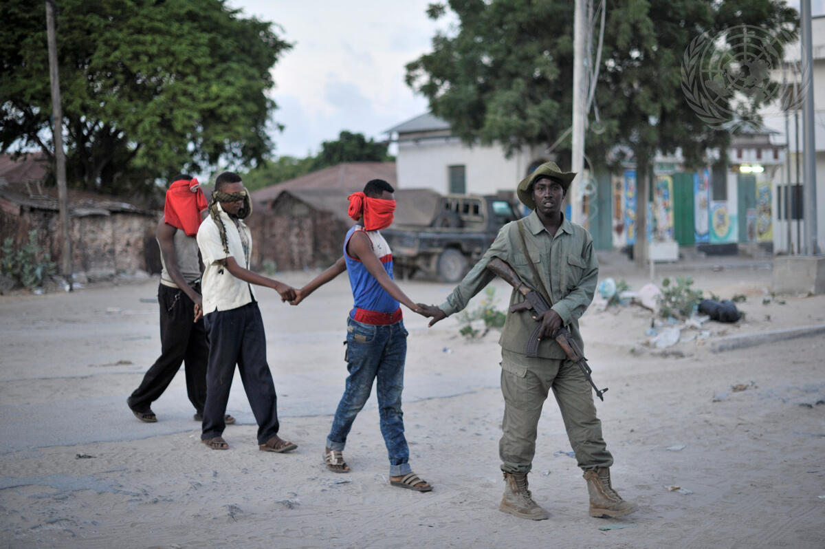 Young men being led to a holding area in an operation aimed at safeguarding security in Mogadishu. Somali National Security Forces, working with the African Union Mission in Somalia (AMISOM), cordoned off on 20 May an area of one square kilometer in the Wardhiigleey district of Mogadishu, to screen young men as part of an operation to weed out al-Shabaab insurgents from the city’s neighbourhoods.