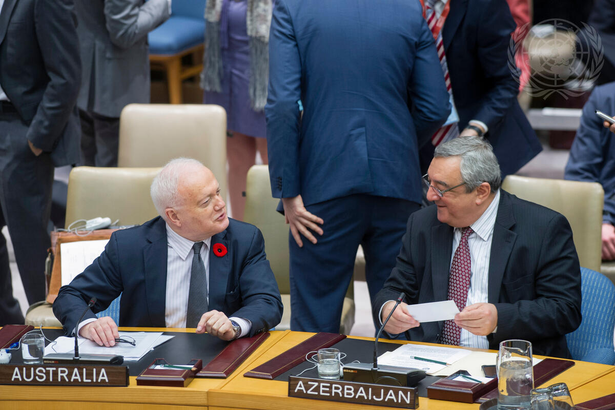 Gary Quinlan (left), Permanent Representative of Australia to the UN, with Agshin Mehdiyev, Permanent Representative of the Republic of Azerbaijan to the UN, at the Council meeting.