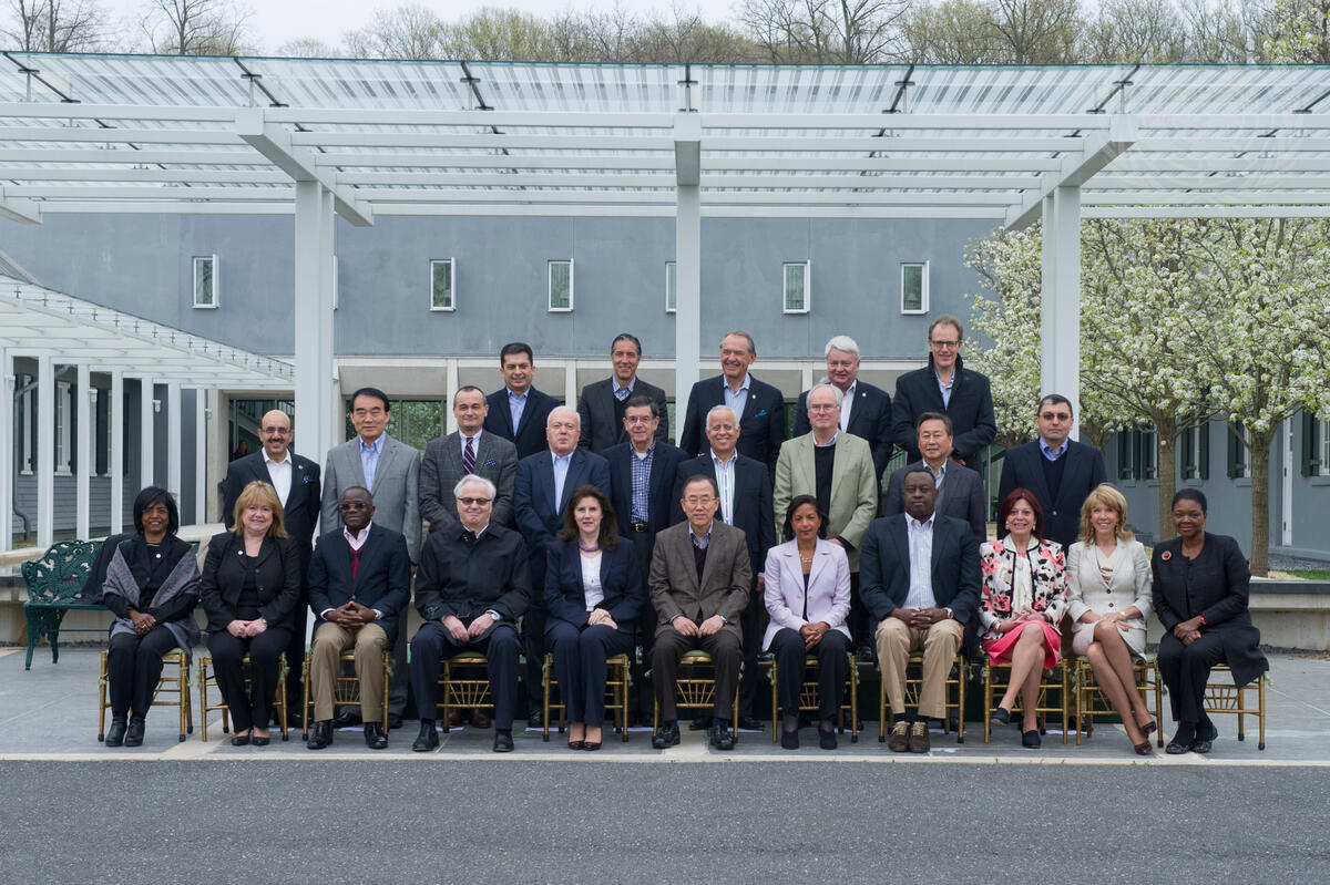 Secretary-General Ban Ki-moon (seated, centre) poses for a group with participants of the retreat.