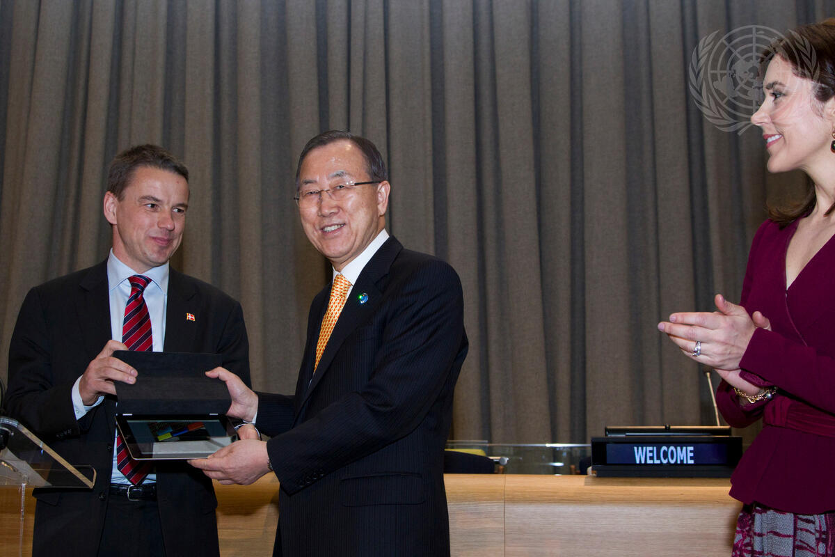Secretary-General Ban Ki-moon (centre) with Christian Friis Bach (left), Minister for Development Cooperation of Denmark, at the inauguration of the newly renovated Trusteeship Council Chamber. The Chamber has been restored and updated with new Danish furniture, designed by the Danish design-duo Kasper Salto and Thomas Sigsgaard.