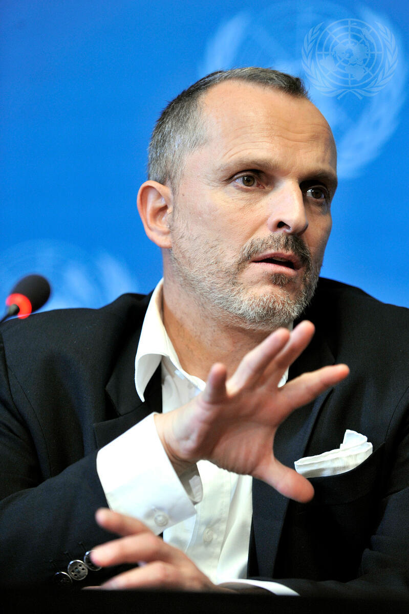 Miguel Bosé, Latin Grammy-winning Spanish/Italian musician and actor, speaks with journalists at a press conference during the International Day of Peace observance at the Palais des Nations, the UN's headquarters in Geneva, Switzerland.