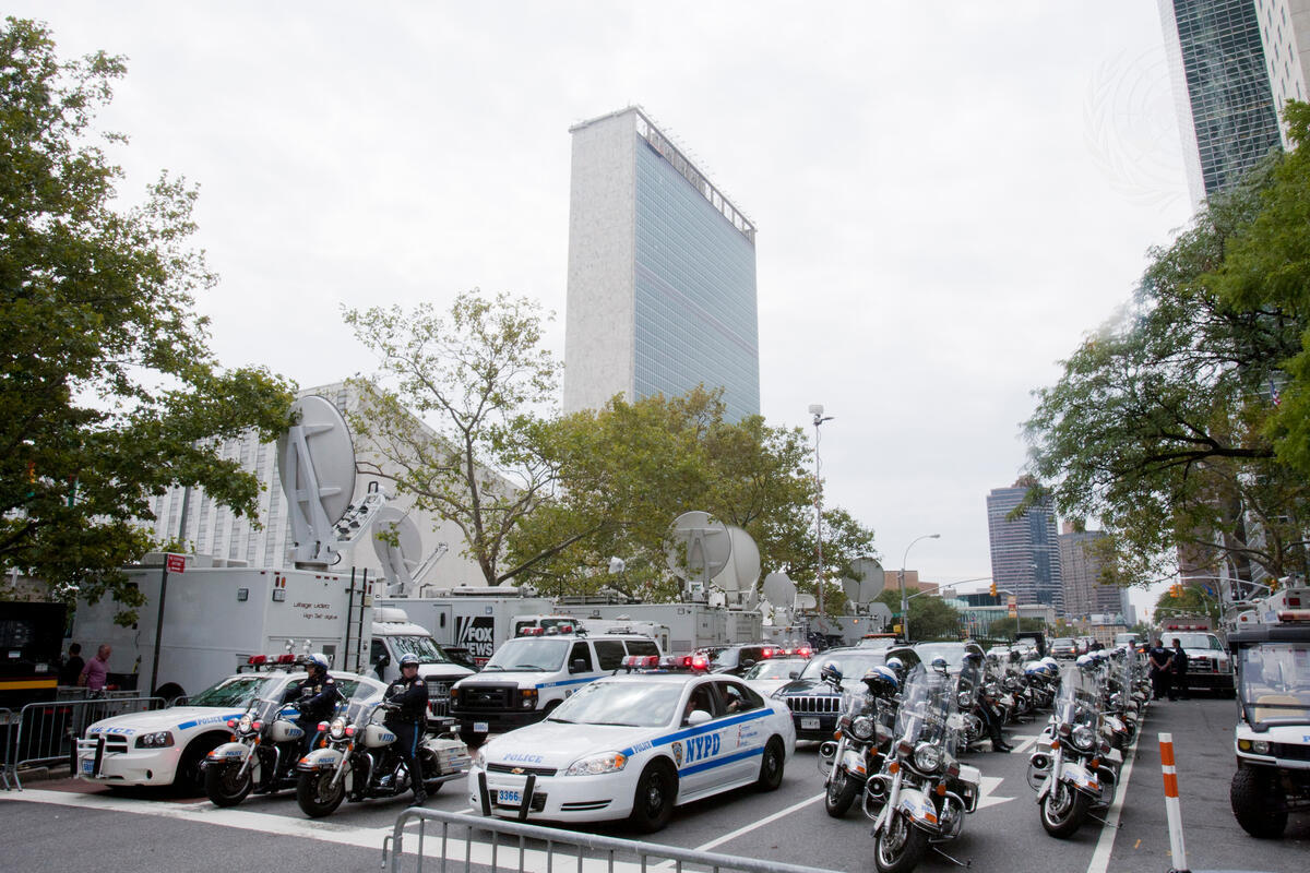 A view of the many news trucks and security vehicles outside UN Headquarters on the opening day of the general debate of the sixty-sixth General Assembly.