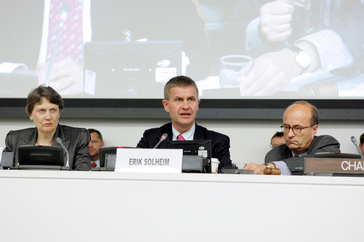 Erik Solheim (centre), Norwegian Minister of the Environment and International Development, addresses an event on reducing emissions from deforestation and forest degradation in developing countries.