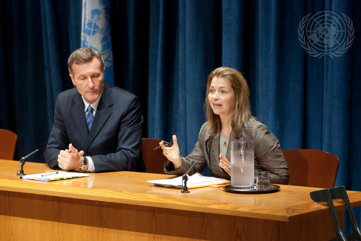 Annika Thunborg (right), Spokesperson for the Comprehensive Nuclear-Test-Ban Treaty Organization (CTBTO), addresses a press conference on the high-level meeting on nuclear safety and security, convened by the Secretary-General and being held at UN Headquarters on 22 September. With her is Tibor Tóth, Executive Secretary of the Preparatory Commission for the CTBTO.