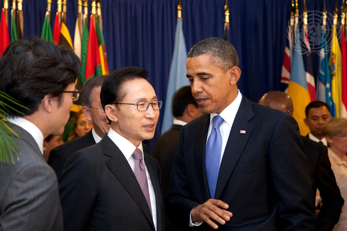 Barack Obama, President of the United States of America, and Lee Myung-bak (centre), President of the Republic of Korea, exchange views at the luncheon hosted by Secretary-General Ban Ki-moon in honour of heads of state and government attending the general debate of the sixty-sixth session of the General Assembly.
