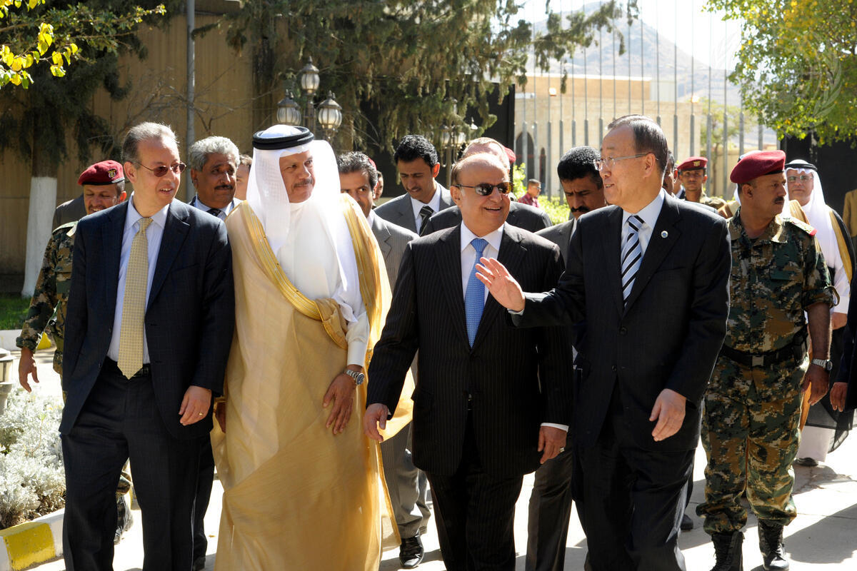 Mr. Ban (in striped tie) is seen with (starting from his right): Abdrabuh Mansour Hadi Mansour, President of the Republic of Yemen; Abdul Latif Bin Rashid Al Zayani, Secretary-General of the Cooperation Council for the Arab States of the Gulf; and Jamal Benomar, UN Special Adviser on Yemen.