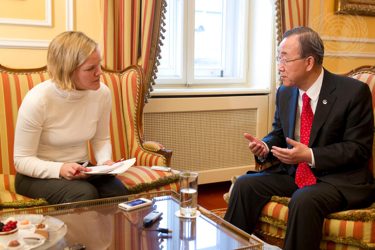 Secretary-General Ban Ki-moon (right) is interviewed by journalist Julia Raabe of the Austrian daily newspaper Der Standard.