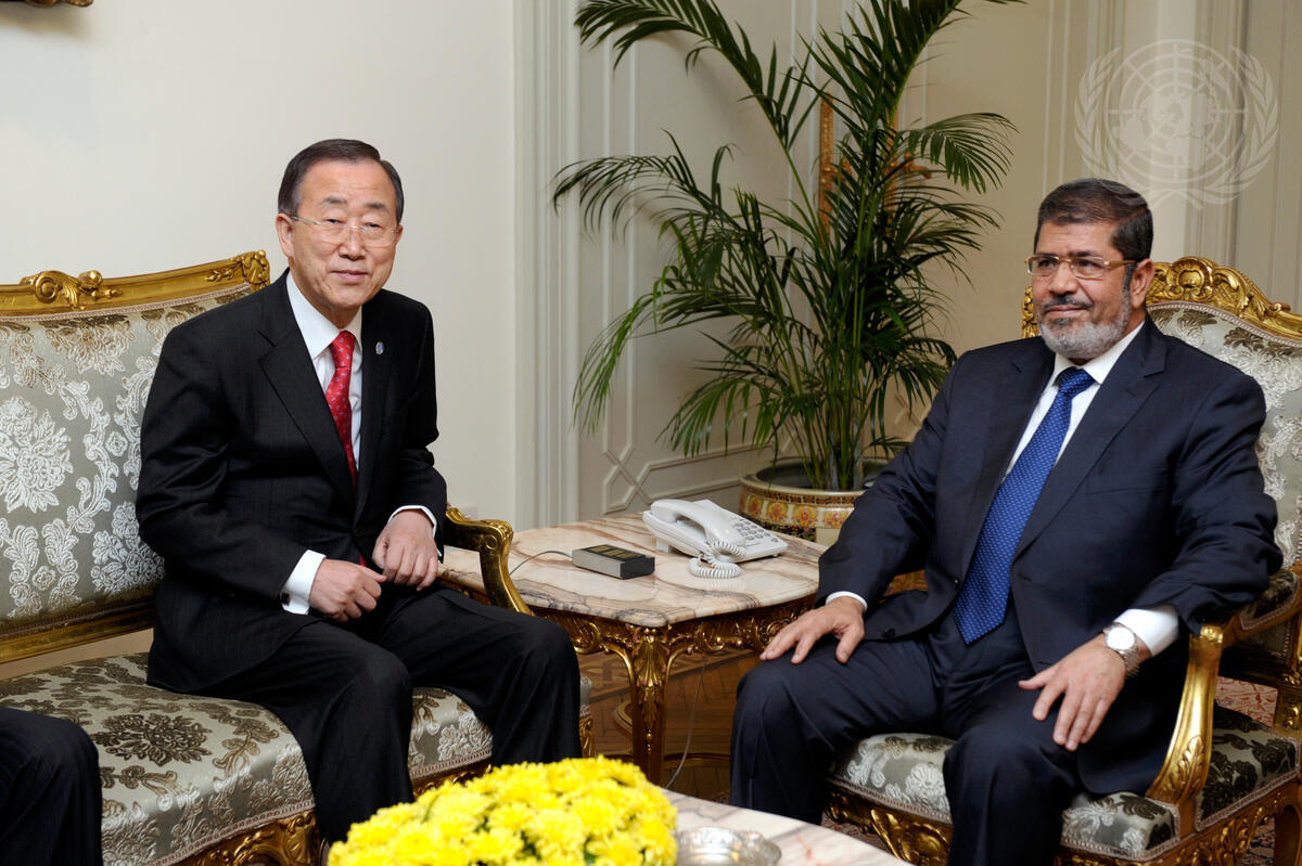Secretary-General Ban Ki-moon (left) meets with Mohamed Morsy, President of Egypt, at the President’s Office in Cairo.