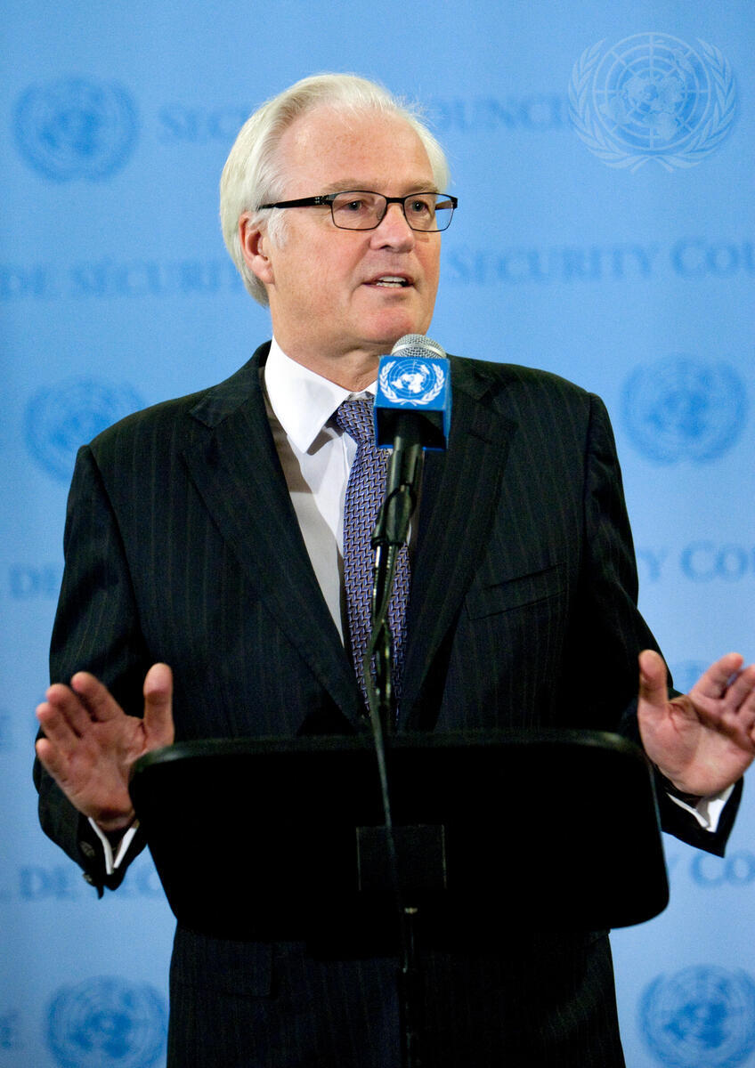 Vitaly I. Churkin, Permanent Representative of the Russian Federation to the UN, speaks to reporters following the Security Council’s closed-door session on Syria. At the meeting Members were briefed by Lakhdar Brahimi, Joint Special Representative of the UN and the League of Arab States for Syria.