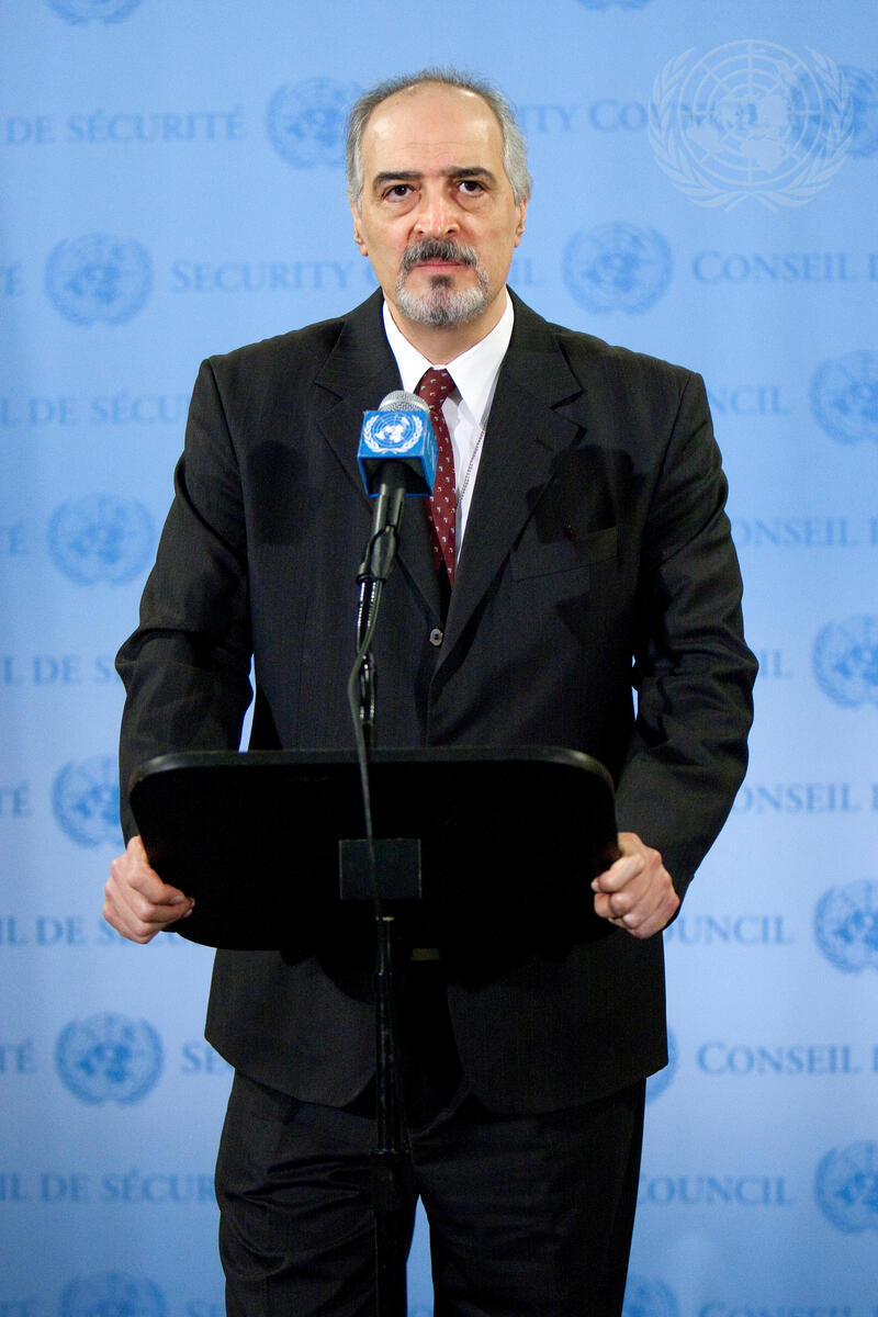 Bashar Ja’afari, Permanent Representative of the Syrian Arab Republic to the UN, speaks to journalists following the Security Council’s closed-door session on his country. At the meeting Council Members were briefed by Lakhdar Brahimi, Joint Special Representative of the UN and the League of Arab States for Syria.