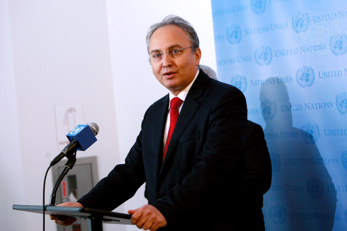 Ambassador Zoran Jolevski of the former Yugoslav Republic of Macedonia briefs correspondents following a meeting with Matthew Nimetz, Personal Envoy of the Secretary-General for the talks between Greece and the former Yugoslav Republic of Macedonia, and Ambassador Adamantios Vassilakis of Greece.