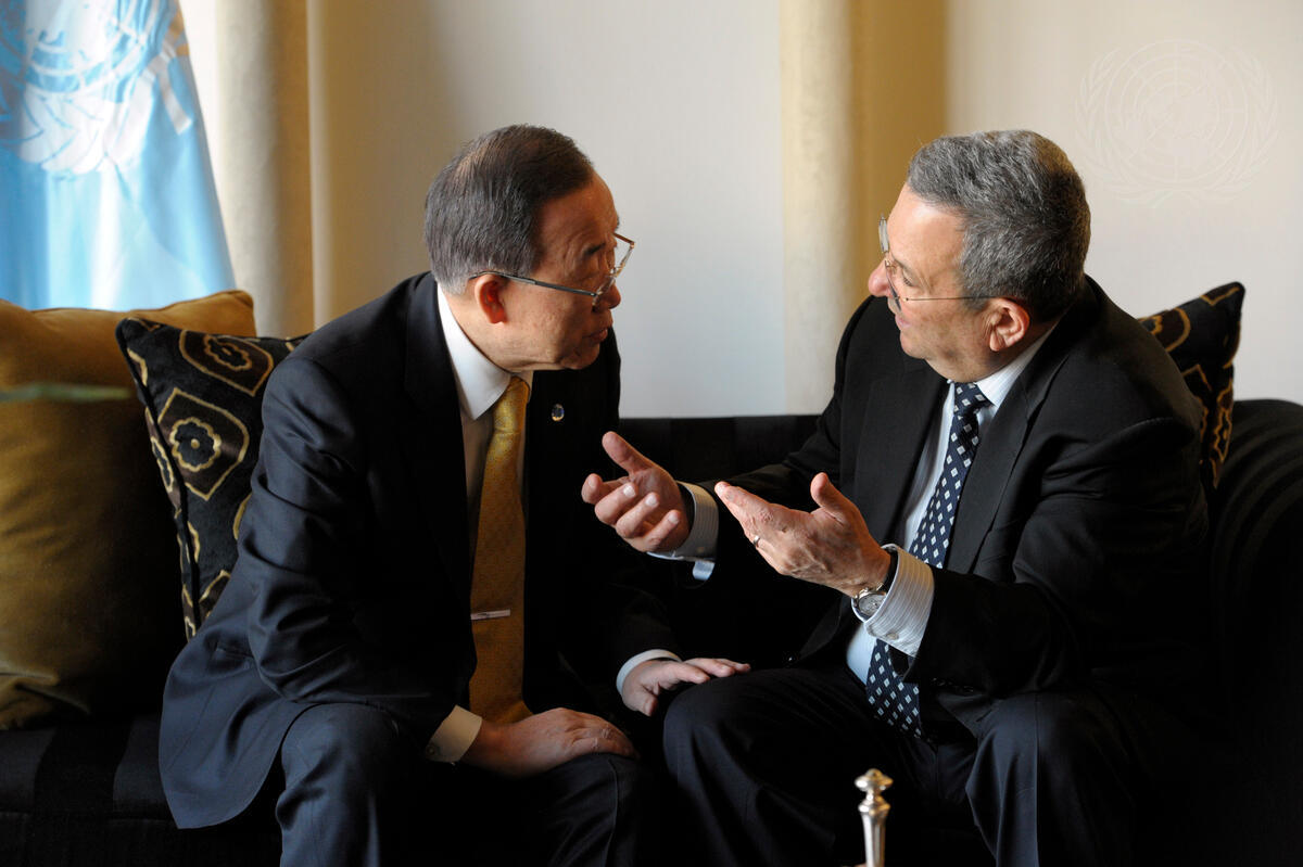 Secretary-General Ban Ki-moon (left) meets with Ehud Barak, Minister of Defense of Israel, at the King David Hotel in Jerusalem.