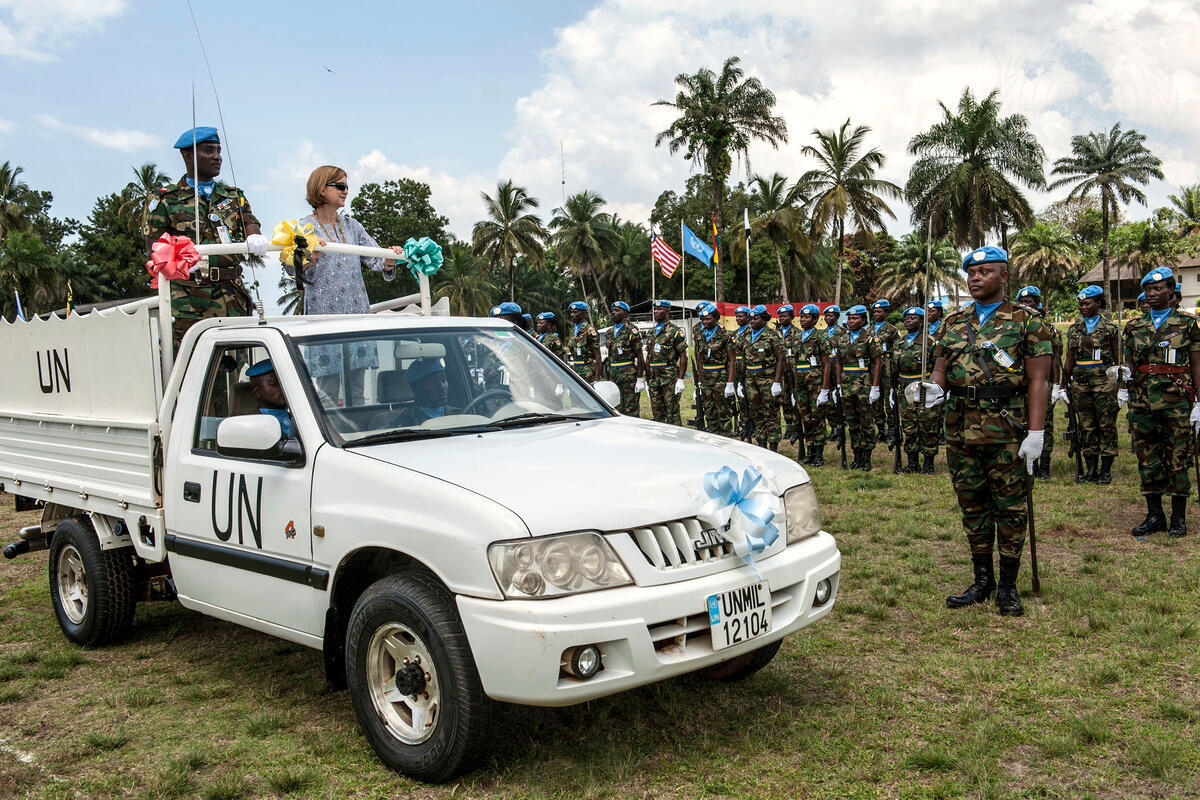 Karin Landgren (standing on truck, right), Special Representative of the Secretary-General for Liberia and Head of the UN Mission in Liberia (UNMIL), reviews UNMIL’s Ghanaian peacekeepers during a medal parade in Buchanan, Liberia.