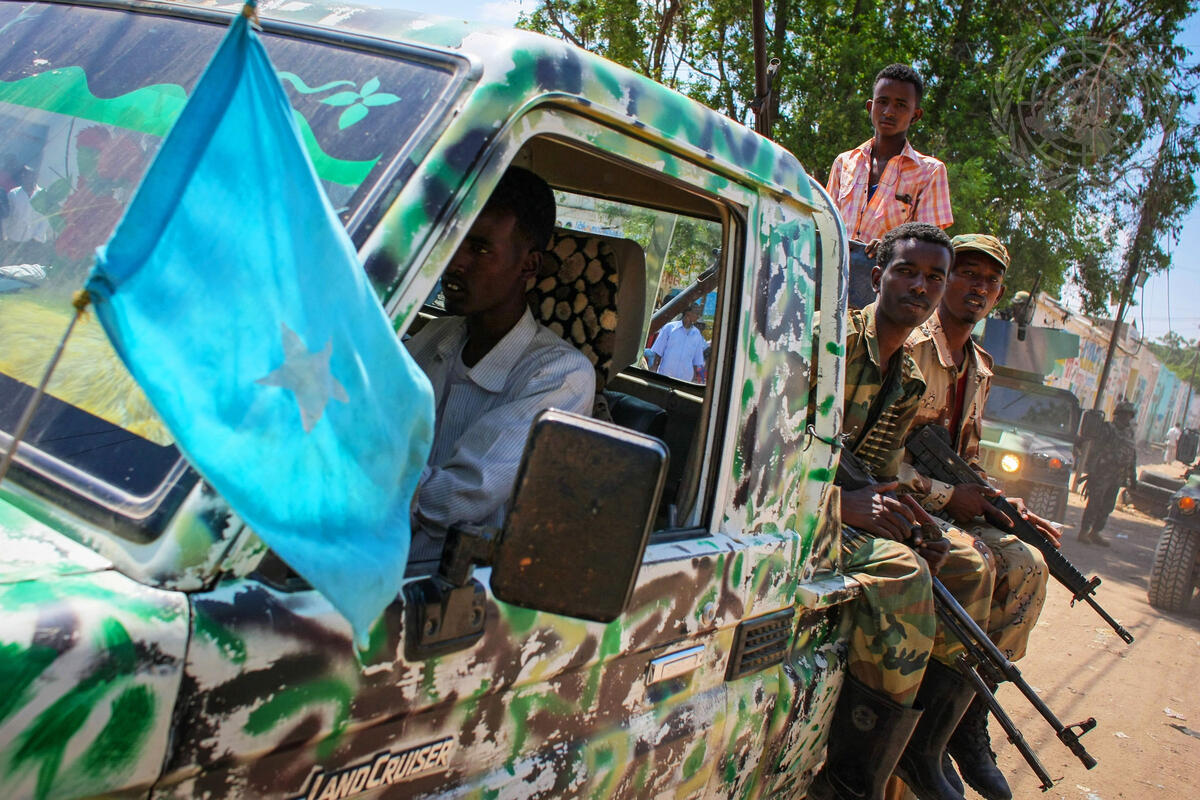 A pickup truck carrying soldiers of the Somali National Army (SNA) passes through the centre of Belet Weyne, some 300 kilometres northwest of capital Mogadishu.