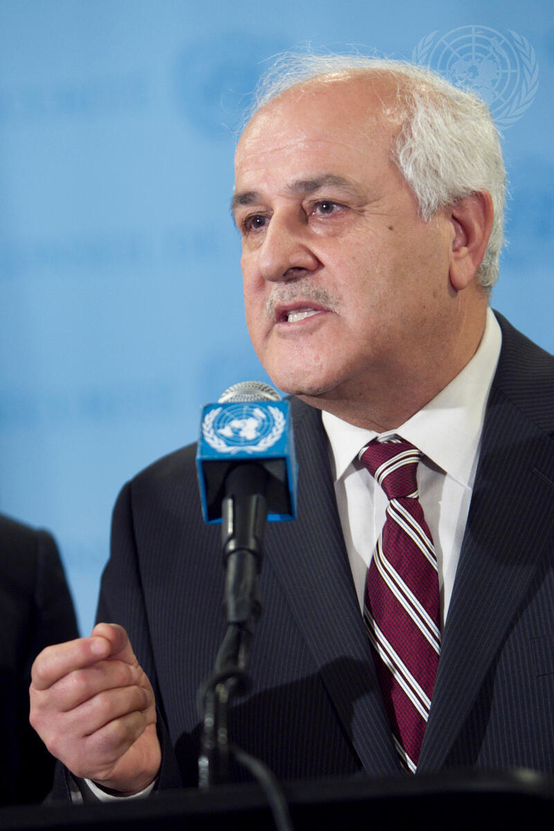 Riyad H. Mansour, Permanent Observer of Palestine to the UN, speaks to the press following the Security Council’s consultations this evening on the situation in Israel and the Palestinian territories.