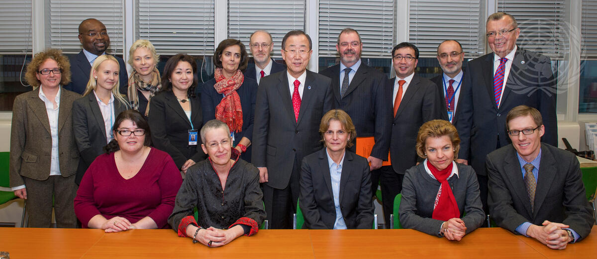 Secretary-General Ban Ki-moon (centre, in red tie) and Yury Fedotov (back row, right), Executive Director of the UN Office on Drugs and Crime (UNODC), pose for a group photo with the Secretariat of the UN Commission on International Trade Law (UNCITRAL) at its offices in Vienna Austria.