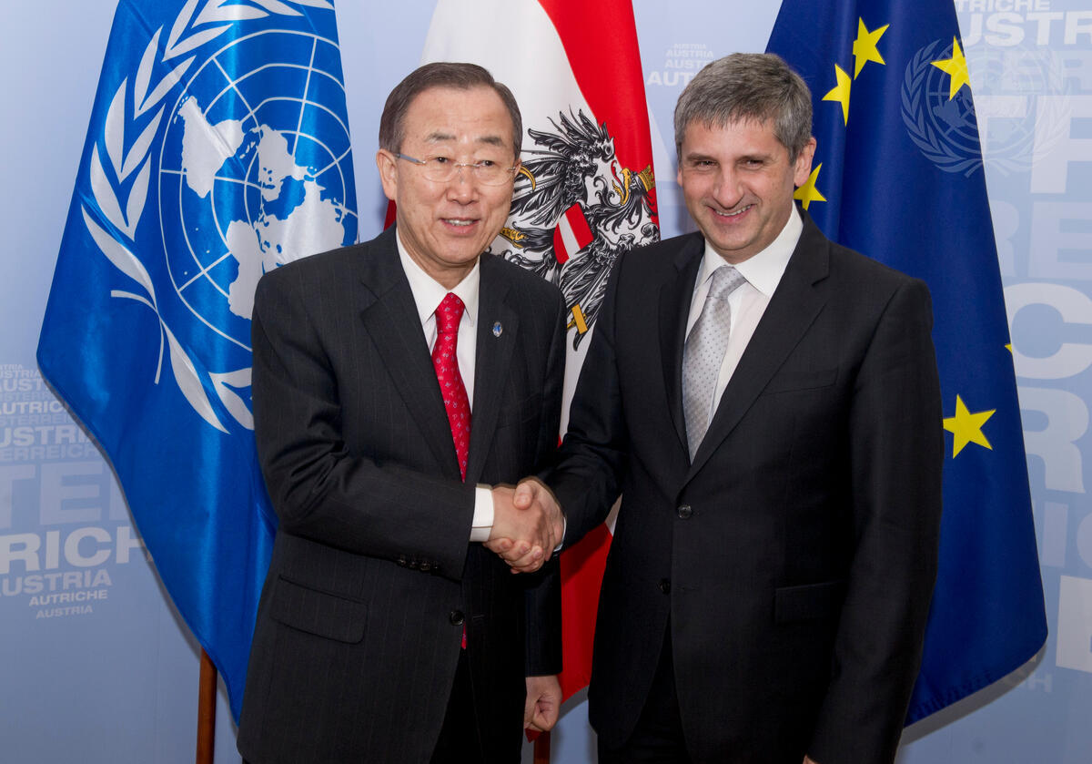Secretary-General Ban Ki-moon (left) meets with Michael Spindelegger, Federal Minister for European and International Affairs, in Vienna.