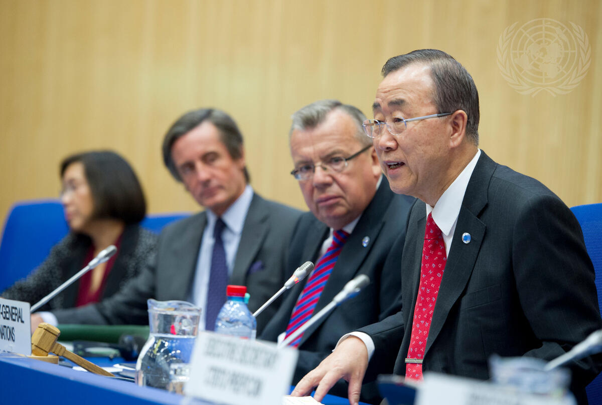 Secretary-General Ban Ki-moon (right) speaks at a town hall meeting with staff members of the UN Office in Vienna (UNOV) and Vienna-based UN agencies. With Mr. Ban: Yury Fedotov (second from right), Executive Director of the UN Office on Drugs and Crime (UNODC) and Director-General of UNOV; and Peter Launsky-Tieffenthal (second from left), Under-Secretary-General for Communications and Public Information.