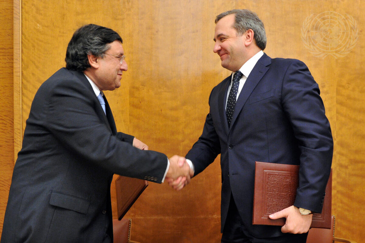 Rashid Khalikov (left), Director of the Office for the Coordination of Humanitarian Affairs (OCHA) in Geneva, and Vladimir Puchkov, Minister of Emergency Situations of the Russian Federation, shake hands after signing a Memorandum of Understanding (MoU) on Disaster Preparedness and Response.
