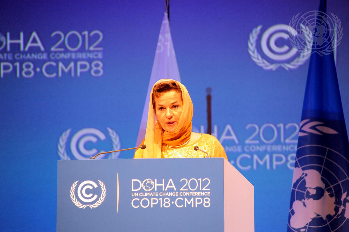 Christiana Figueres, Executive Secretary of the United Nations Framework Convention on Climate Change (UNFCCC), speaks at the opening of the 2012 UN Climate Change Conference, COP18/CMP8 (18th session of the Conference of the Parties and 8th session of the Conference of the Parties serving as the meeting of the Parties to the Kyoto Protocol), held from 26 November to 7 December in Doha, Qatar.