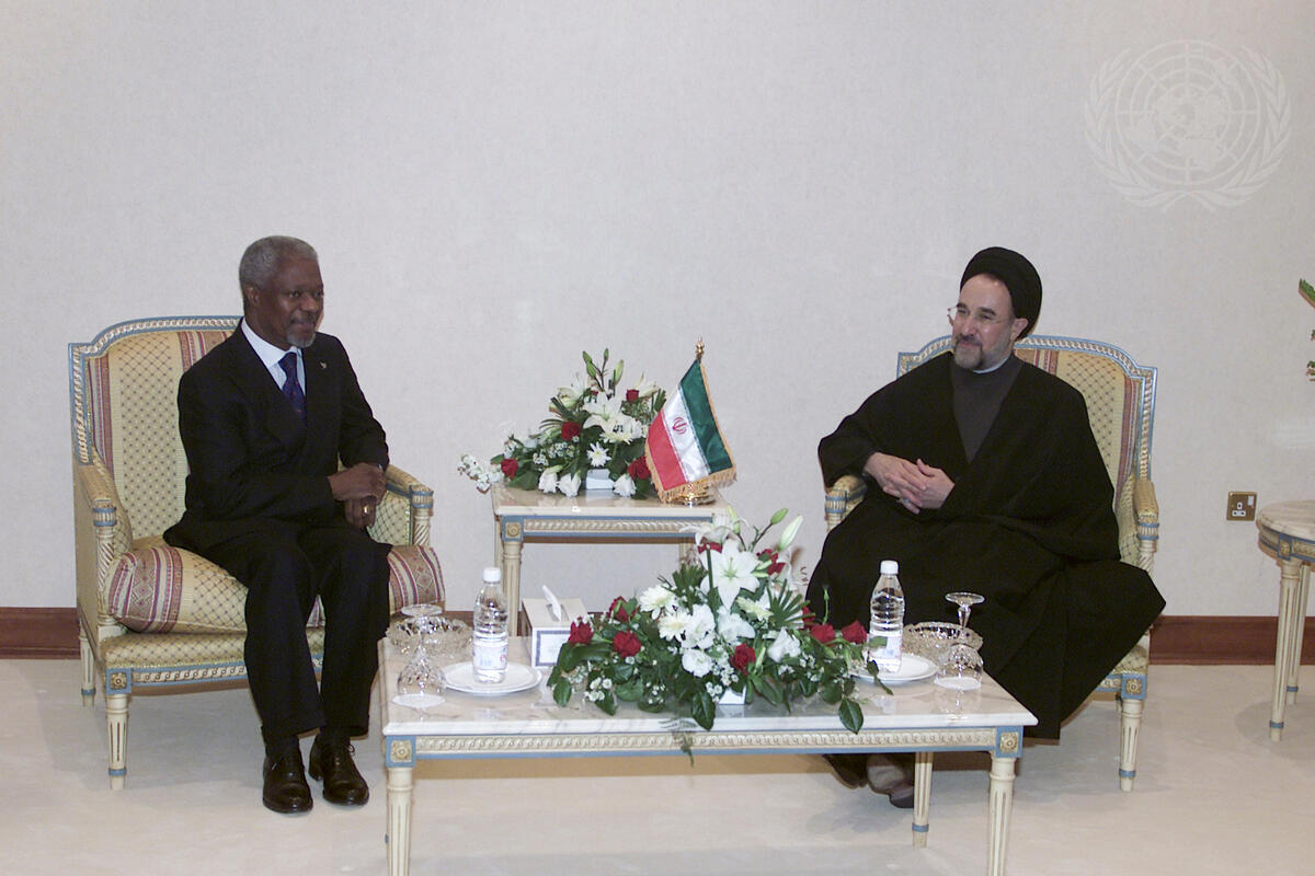 Secretary-General Kofi Annan (left) meeting with the President of Iran, His Excellency Seyed Mohammad Khatami, during his visit to Qatar.