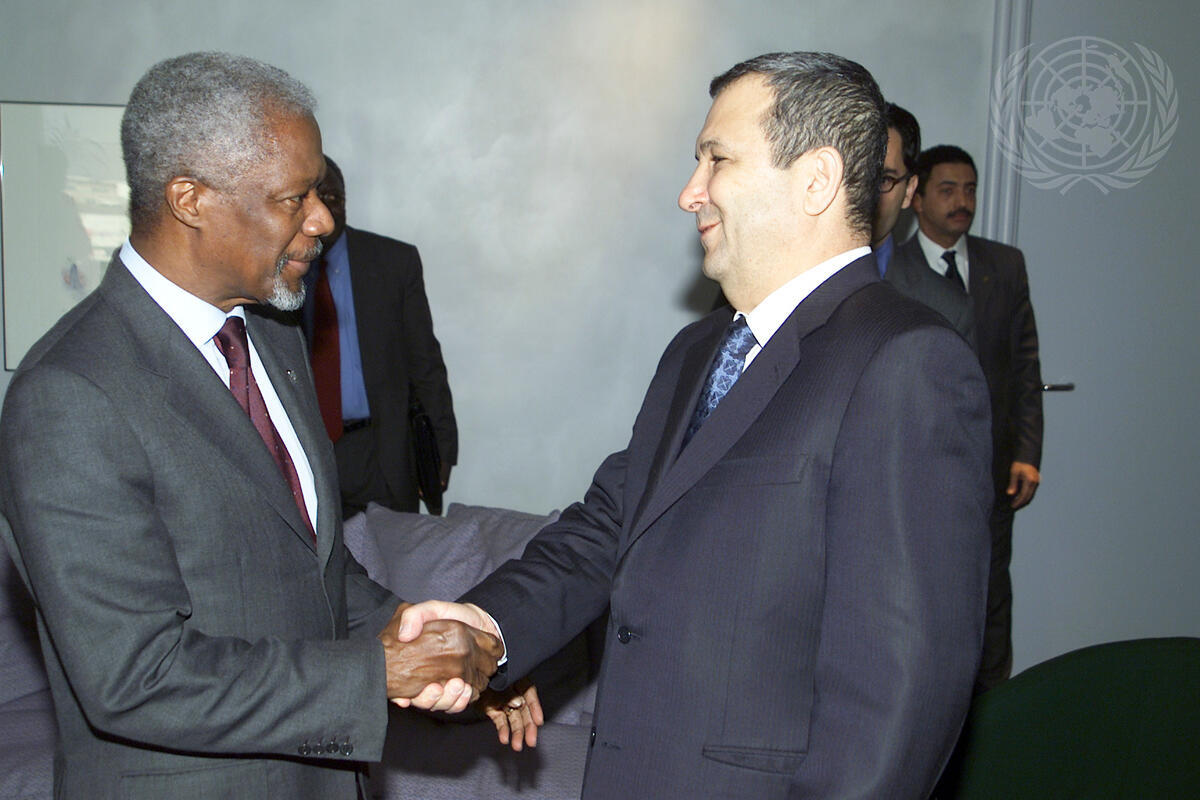 Secretary-General Kofi Annan (left) meets with Prime Minister Ehud Barak of Israel at Heathrow Airport in London. The Secretary-General was returning from an official visit to Bahrain and Qatar.