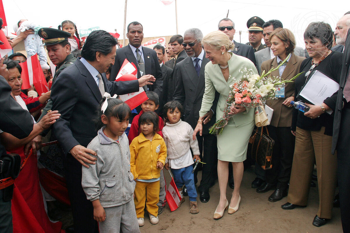 Nane Annan (with flowers), Secretary-Generral Kofi Annan (left of Mrs. Annan), and Alejandro Toledo Manrique (left), visit the Chavin de Huantar Human Settlement at Villa El Salvador, an informal settlement just on the outskirts of Lima.