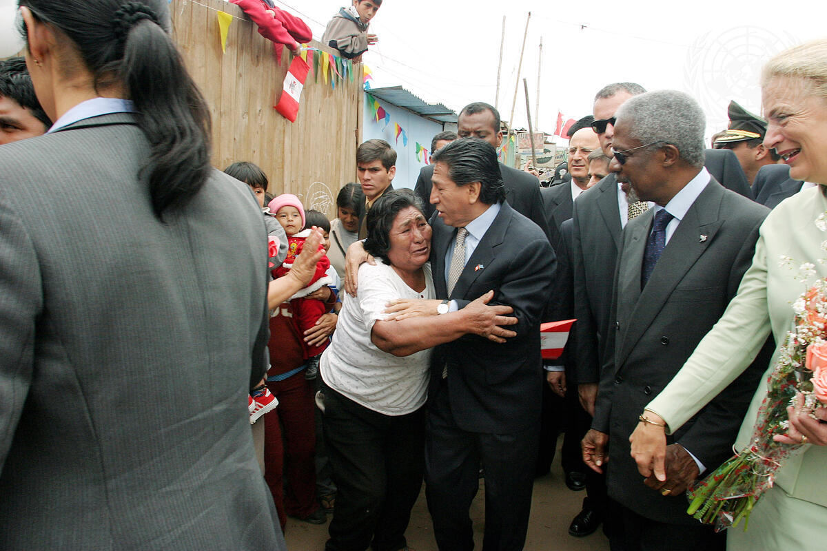 Secretary-General Kofi Annan (second from right) and Nane Annan (right), and Alejandro Toledo Manrique (hugging woman), visit the Chavin de Huantar Human Settlement at Villa El Salvador, an informal settlement just on the outskirts of Lima.